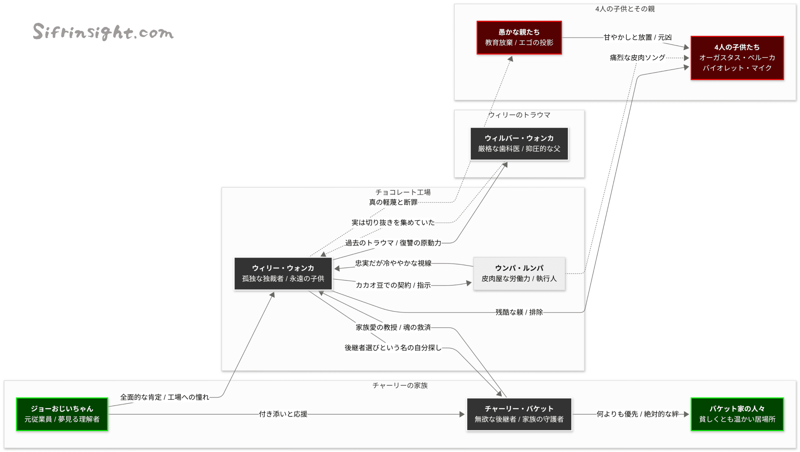 この「追加された父の影」こそが、ウォンカの異常な行動原理を読み解くためのマスターキーである。彼が子供たち(とその親)に向けた残酷な眼差しの正体は、このバックグラウンドを抜きにしては決して語れないのだ。