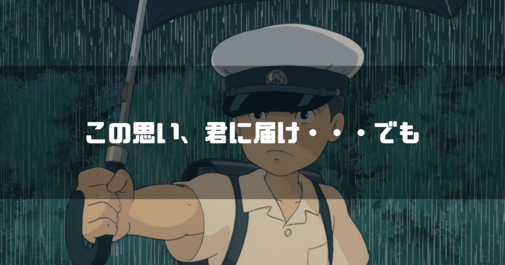 ただ、何よりも切ないのは無力に立ち尽くすカンタとサツキの距離である。あの距離はカンタがどうしても縮めたい心の距離であり、まだ彼にはほぼ無限と思える距離である。