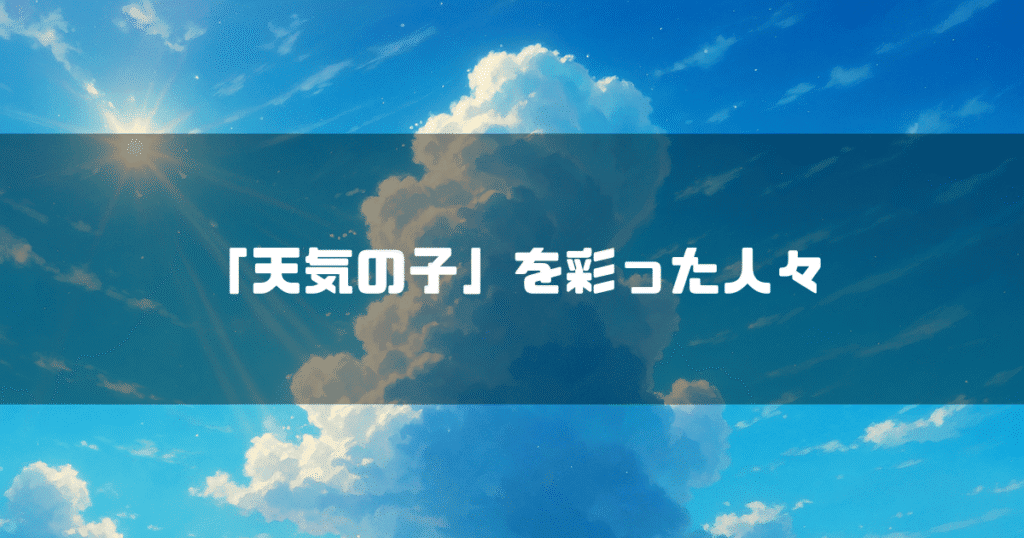 声を担当したのは俳優の倍賞千恵子さん。アニメーションの声優としては「ハウルの動く城」のソフィー役が印象に残っている。「天気の子」においても物語のラスト付近で帆高に大切なことを伝える役となっている。