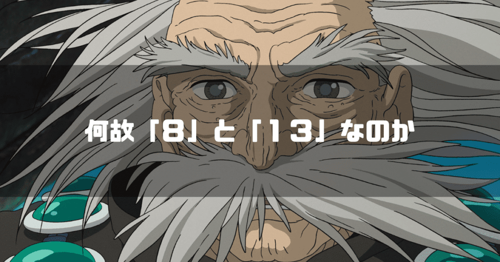 映画「君たちはどう生きるか」のキャラクター大叔父と「何故『8』と『13』なのか」というタイトルテキストを重ねたアイキャッチ