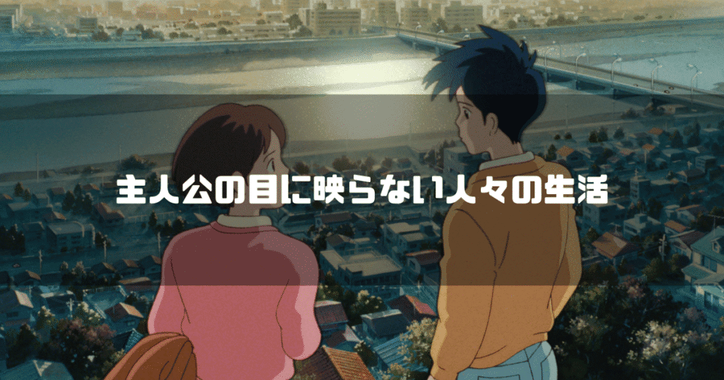 映画「耳をすませば」は、街の夜景の空からのショットから始まる。それは「平成狸合戦ぽんぽこ」のエンディングと地続きのショットであると捉えられる。「ぽんぽこ」ではカメラが引いて夜景になり、「耳すま」ではカメラがよって人々の生活シーンになる。こういう構造を見ると、どうしても「平成狸合戦ぽんぽこ」を意識せざるを得ない。