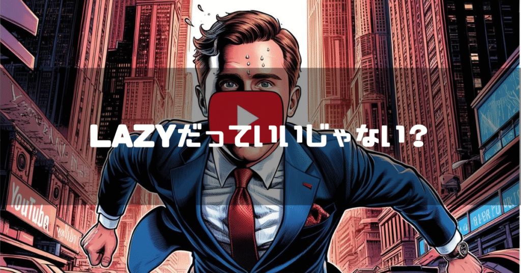 遅刻しそうな男性の絵を背景に「LAZYだっていいじゃない?」というタイトル文字を重ねたアイキャッチ